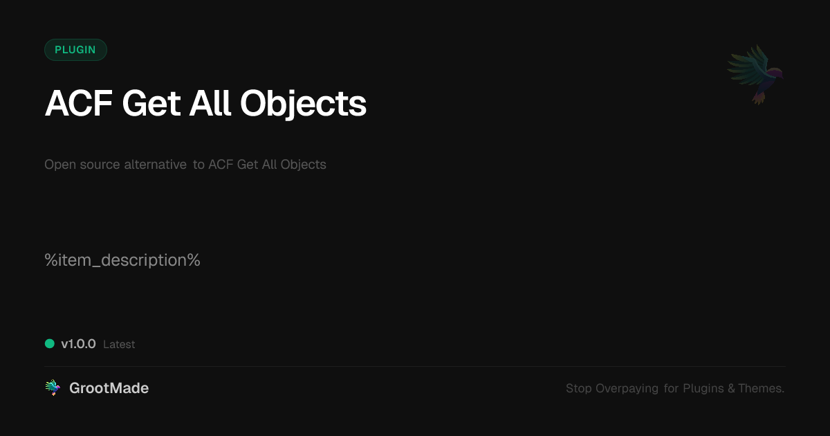 GrootMade is NOT affiliated with ACF Get All Objects or its original author. ACF Get All Objects™ is a trademark of its respective owner and use of it does not imply any endorsement or affiliation. This product has been forked under the GNU General Public License (GPL) and all non-GPL assets (such as proprietary images, fonts, and branding) have been removed. Distributing GPL-licensed code is 100% legal.