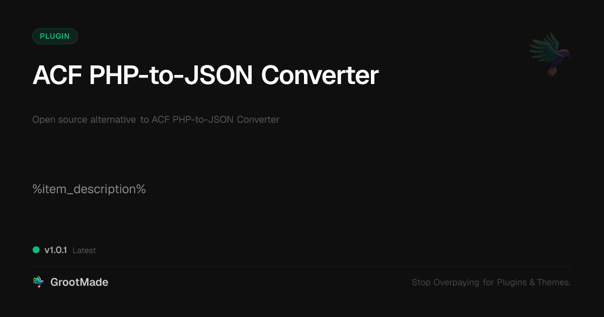 GrootMade is NOT affiliated with ACF PHP-to-JSON Converter or its original author. ACF PHP-to-JSON Converter™ is a trademark of its respective owner and use of it does not imply any endorsement or affiliation. This product has been forked under the GNU General Public License (GPL) and all non-GPL assets (such as proprietary images, fonts, and branding) have been removed. Distributing GPL-licensed code is 100% legal.
