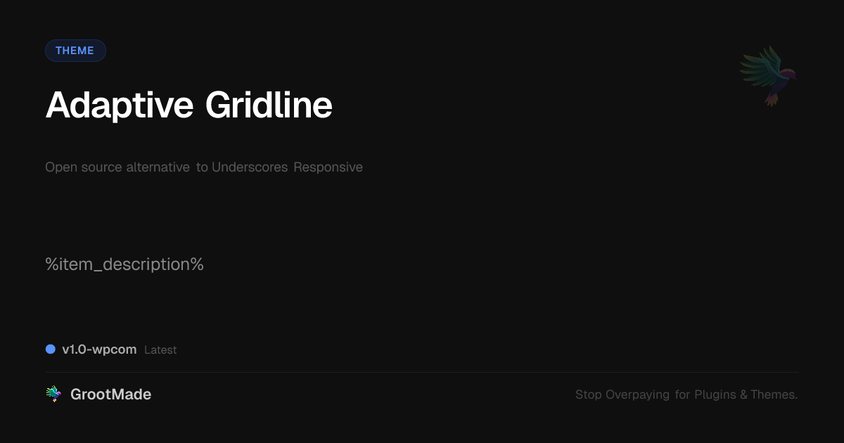 GrootMade is NOT affiliated with Underscores Responsive or its original author. Underscores Responsive™ is a trademark of its respective owner and use of it does not imply any endorsement or affiliation. This product has been forked under the GNU General Public License (GPL) and all non-GPL assets (such as proprietary images, fonts, and branding) have been removed. Distributing GPL-licensed code is 100% legal.