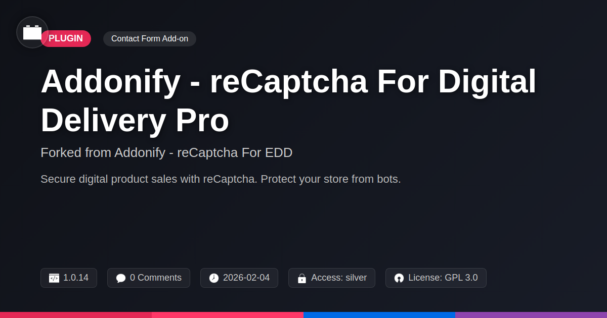 GrootMade is NOT affiliated with Addonify - reCaptcha For EDD or its original author. Addonify - reCaptcha For EDD™ is a trademark of its respective owner and use of it does not imply any endorsement or affiliation. This product has been forked under the GNU General Public License (GPL) and all non-GPL assets (such as proprietary images, fonts, and branding) have been removed. Distributing GPL-licensed code is 100% legal.
