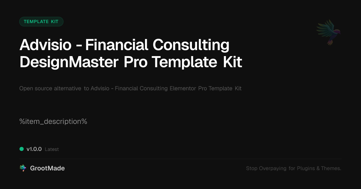 GrootMade is NOT affiliated with Advisio - Financial Consulting Elementor Pro Template Kit or its original author. Advisio - Financial Consulting Elementor Pro Template Kit™ is a trademark of its respective owner and use of it does not imply any endorsement or affiliation. This product has been forked under the GNU General Public License (GPL) and all non-GPL assets (such as proprietary images, fonts, and branding) have been removed. Distributing GPL-licensed code is 100% legal.