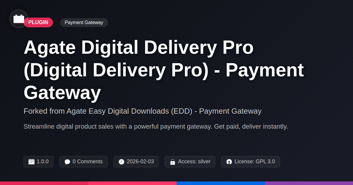 GrootMade is NOT affiliated with Agate Easy Digital Downloads (EDD) - Payment Gateway or its original author. Agate Easy Digital Downloads (EDD) - Payment Gateway™ is a trademark of its respective owner and use of it does not imply any endorsement or affiliation. This product has been forked under the GNU General Public License (GPL) and all non-GPL assets (such as proprietary images, fonts, and branding) have been removed. Distributing GPL-licensed code is 100% legal.
