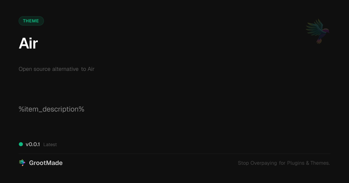 GrootMade is NOT affiliated with Air or its original author. Air™ is a trademark of its respective owner and use of it does not imply any endorsement or affiliation. This product has been forked under the GNU General Public License (GPL) and all non-GPL assets (such as proprietary images, fonts, and branding) have been removed. Distributing GPL-licensed code is 100% legal.