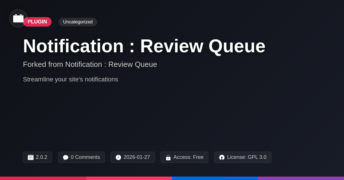 GrootMade is NOT affiliated with Notification : Review Queue or its original author. Notification : Review Queue™ is a trademark of its respective owner and use of it does not imply any endorsement or affiliation. This product has been forked under the GNU General Public License (GPL) and all non-GPL assets (such as proprietary images, fonts, and branding) have been removed. Distributing GPL-licensed code is 100% legal.