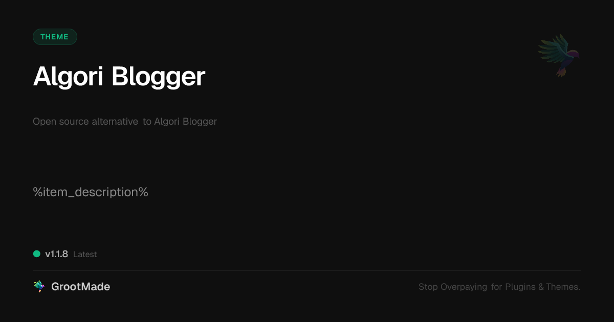 GrootMade is NOT affiliated with Algori Blogger or its original author. Algori Blogger™ is a trademark of its respective owner and use of it does not imply any endorsement or affiliation. This product has been forked under the GNU General Public License (GPL) and all non-GPL assets (such as proprietary images, fonts, and branding) have been removed. Distributing GPL-licensed code is 100% legal.
