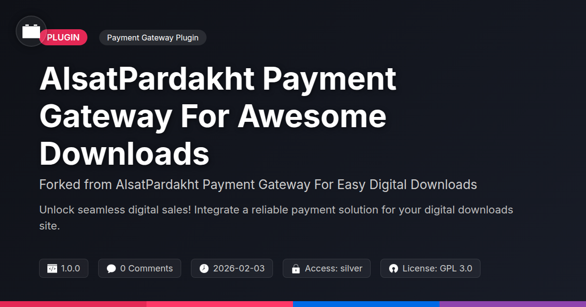 GrootMade is NOT affiliated with AlsatPardakht Payment Gateway For Easy Digital Downloads or its original author. AlsatPardakht Payment Gateway For Easy Digital Downloads™ is a trademark of its respective owner and use of it does not imply any endorsement or affiliation. This product has been forked under the GNU General Public License (GPL) and all non-GPL assets (such as proprietary images, fonts, and branding) have been removed. Distributing GPL-licensed code is 100% legal.