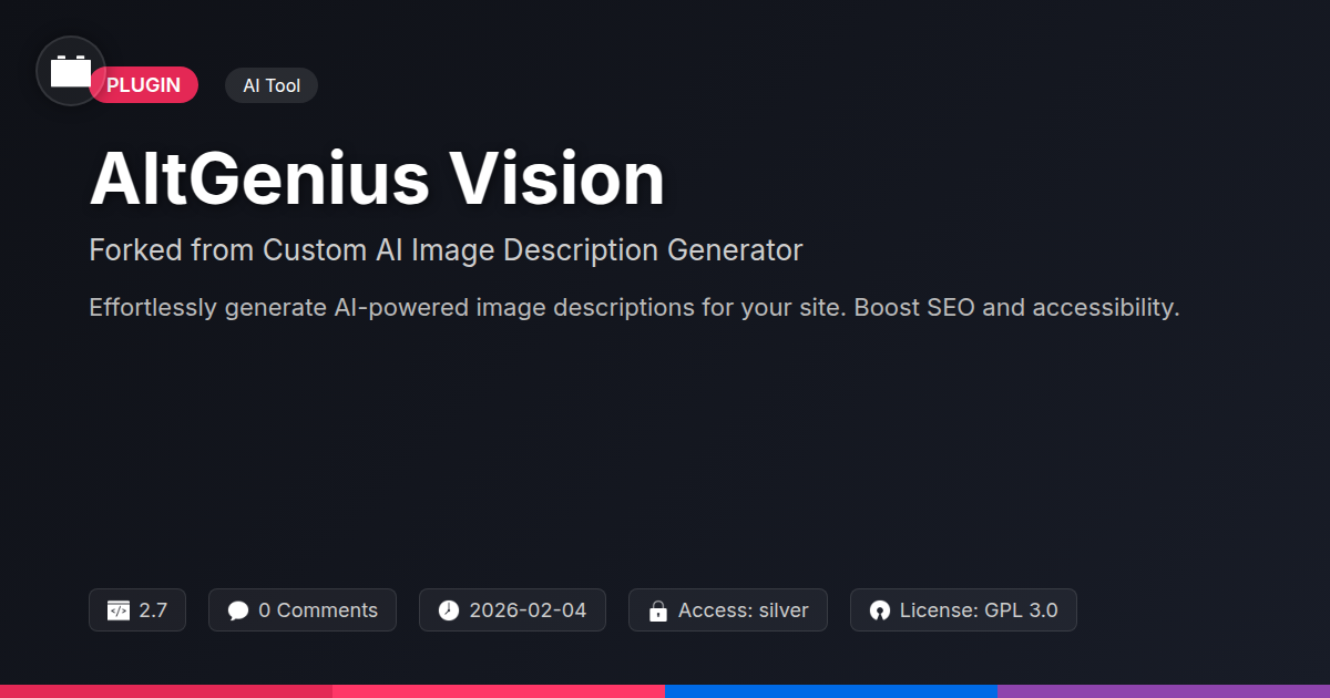 GrootMade is NOT affiliated with Custom AI Image Description Generator or its original author. Custom AI Image Description Generator™ is a trademark of its respective owner and use of it does not imply any endorsement or affiliation. This product has been forked under the GNU General Public License (GPL) and all non-GPL assets (such as proprietary images, fonts, and branding) have been removed. Distributing GPL-licensed code is 100% legal.