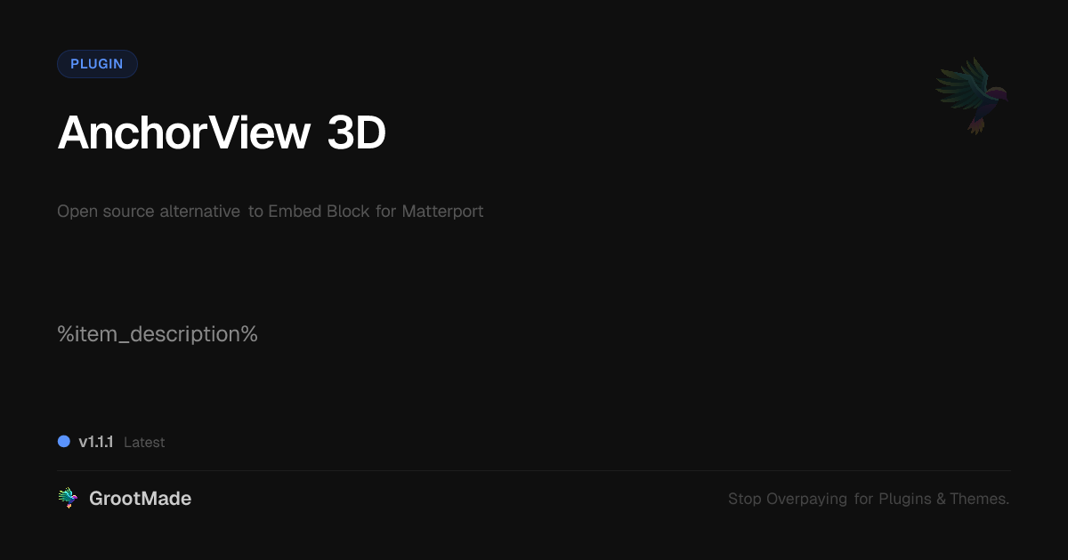 GrootMade is NOT affiliated with Embed Block for Matterport or its original author. Embed Block for Matterport™ is a trademark of its respective owner and use of it does not imply any endorsement or affiliation. This product has been forked under the GNU General Public License (GPL) and all non-GPL assets (such as proprietary images, fonts, and branding) have been removed. Distributing GPL-licensed code is 100% legal.