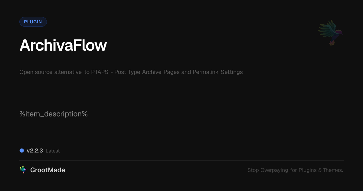 GrootMade is NOT affiliated with PTAPS - Post Type Archive Pages and Permalink Settings or its original author. PTAPS - Post Type Archive Pages and Permalink Settings™ is a trademark of its respective owner and use of it does not imply any endorsement or affiliation. This product has been forked under the GNU General Public License (GPL) and all non-GPL assets (such as proprietary images, fonts, and branding) have been removed. Distributing GPL-licensed code is 100% legal.