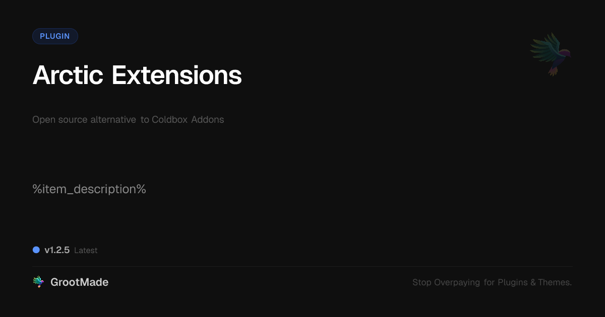 GrootMade is NOT affiliated with Coldbox Addons or its original author. Coldbox Addons™ is a trademark of its respective owner and use of it does not imply any endorsement or affiliation. This product has been forked under the GNU General Public License (GPL) and all non-GPL assets (such as proprietary images, fonts, and branding) have been removed. Distributing GPL-licensed code is 100% legal.