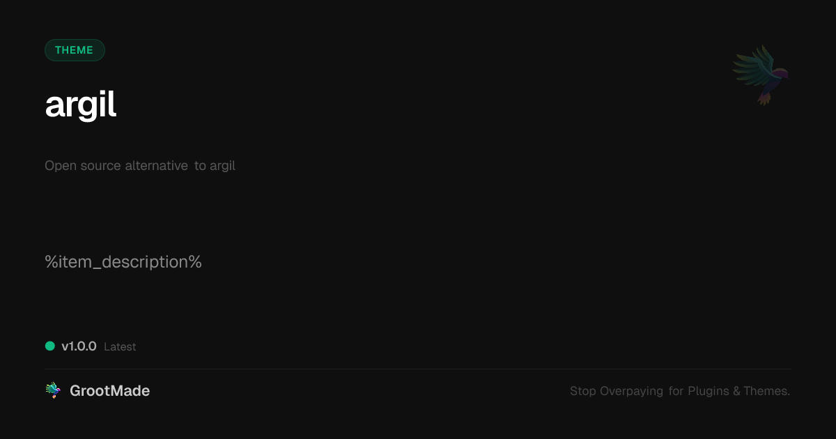 GrootMade is NOT affiliated with argil or its original author. argil™ is a trademark of its respective owner and use of it does not imply any endorsement or affiliation. This product has been forked under the GNU General Public License (GPL) and all non-GPL assets (such as proprietary images, fonts, and branding) have been removed. Distributing GPL-licensed code is 100% legal.