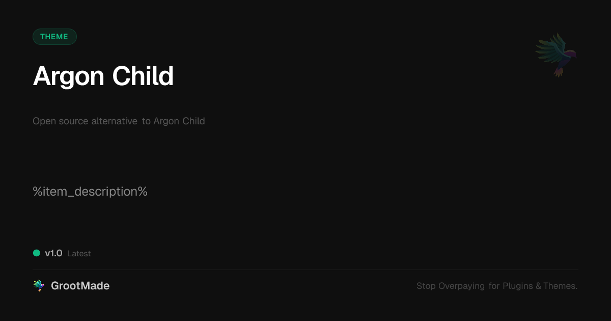 GrootMade is NOT affiliated with Argon Child or its original author. Argon Child™ is a trademark of its respective owner and use of it does not imply any endorsement or affiliation. This product has been forked under the GNU General Public License (GPL) and all non-GPL assets (such as proprietary images, fonts, and branding) have been removed. Distributing GPL-licensed code is 100% legal.