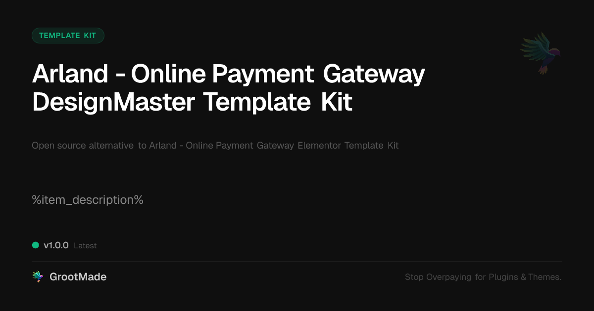 GrootMade is NOT affiliated with Arland - Online Payment Gateway Elementor Template Kit or its original author. Arland - Online Payment Gateway Elementor Template Kit™ is a trademark of its respective owner and use of it does not imply any endorsement or affiliation. This product has been forked under the GNU General Public License (GPL) and all non-GPL assets (such as proprietary images, fonts, and branding) have been removed. Distributing GPL-licensed code is 100% legal.