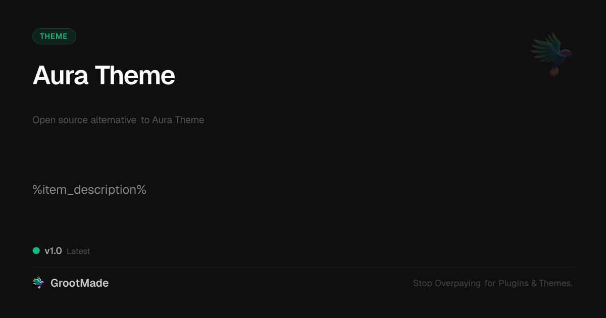 GrootMade is NOT affiliated with Aura Theme or its original author. Aura Theme™ is a trademark of its respective owner and use of it does not imply any endorsement or affiliation. This product has been forked under the GNU General Public License (GPL) and all non-GPL assets (such as proprietary images, fonts, and branding) have been removed. Distributing GPL-licensed code is 100% legal.