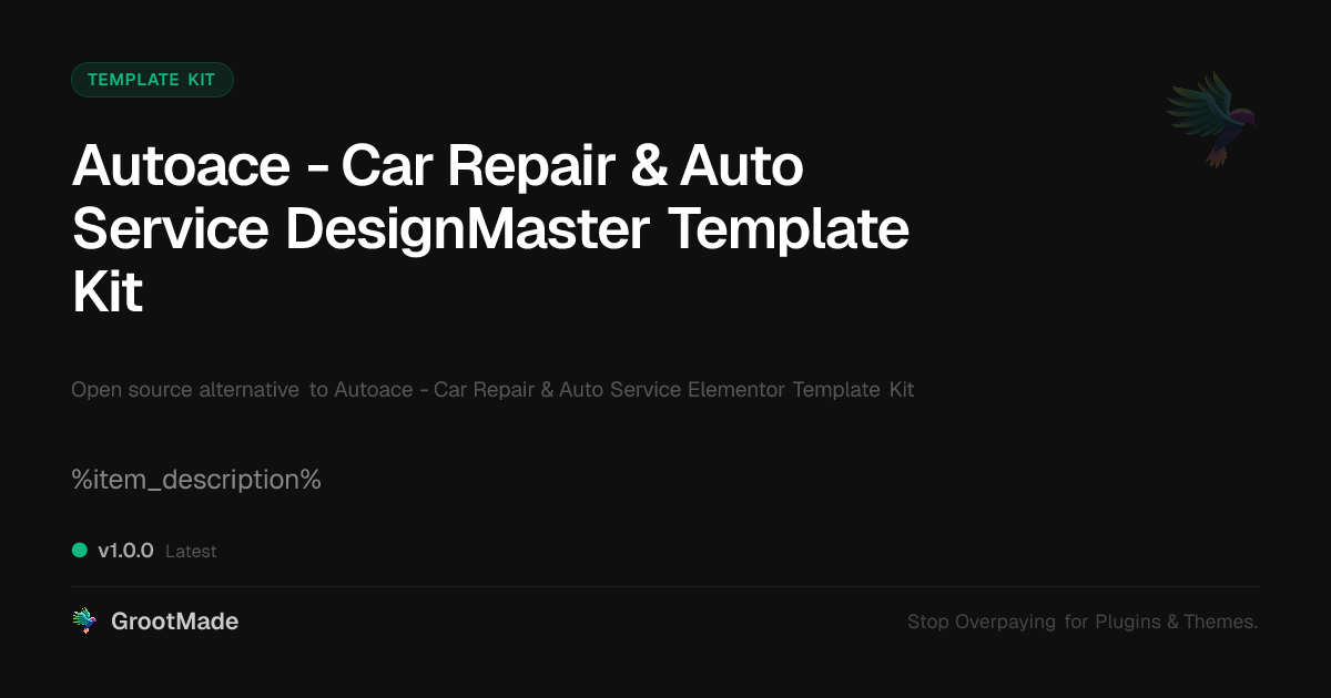 GrootMade is NOT affiliated with Autoace - Car Repair & Auto Service Elementor Template Kit or its original author. Autoace - Car Repair & Auto Service Elementor Template Kit™ is a trademark of its respective owner and use of it does not imply any endorsement or affiliation. This product has been forked under the GNU General Public License (GPL) and all non-GPL assets (such as proprietary images, fonts, and branding) have been removed. Distributing GPL-licensed code is 100% legal.