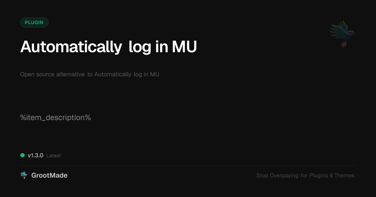 GrootMade is NOT affiliated with Automatically log in MU or its original author. Automatically log in MU™ is a trademark of its respective owner and use of it does not imply any endorsement or affiliation. This product has been forked under the GNU General Public License (GPL) and all non-GPL assets (such as proprietary images, fonts, and branding) have been removed. Distributing GPL-licensed code is 100% legal.