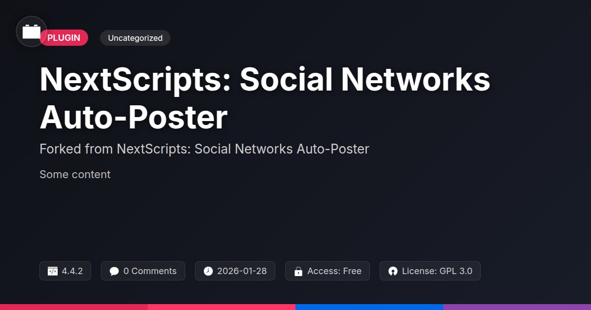 GrootMade is NOT affiliated with NextScripts: Social Networks Auto-Poster or its original author. NextScripts: Social Networks Auto-Poster™ is a trademark of its respective owner and use of it does not imply any endorsement or affiliation. This product has been forked under the GNU General Public License (GPL) and all non-GPL assets (such as proprietary images, fonts, and branding) have been removed. Distributing GPL-licensed code is 100% legal.