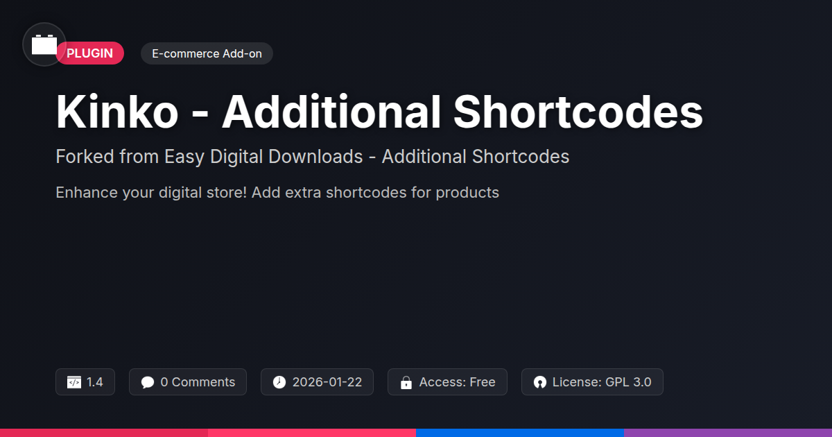 So, there you have it. Kinko - Additional Shortcodes: the plugin that takes your digital storefront from 'meh' to 'magnifique' without requiring a degree in advanced astrophysics. We've journeyed through the plains of basic layouts, armed ourselves with a shiny new arsenal of shortcodes, understood the noble 'forked' lineage, and even envisioned the sheer relief flooding through agency offices. For all you discerning developers, pragmatic agencies, and glorious open-source evangelists out there, this isn't just another plugin; it's a passport to more professional, more engaging, and frankly, more profitable digital product sales. You’ve seen how it can transform cluttered product lists into beautifully curated galleries, make pricing tables so clear they could explain quantum physics, and generally make your clients stop asking 'Can you just…' and start asking 'How did you do that?'. It's about smarter work, not harder work. It's about leveraging the incredible foundation of existing tools and adding that extra spark of genius. So, go ahead, ditch the plain old tags and embrace the power of purposeful shortcodes. Your future, less-stressed self will thank you.