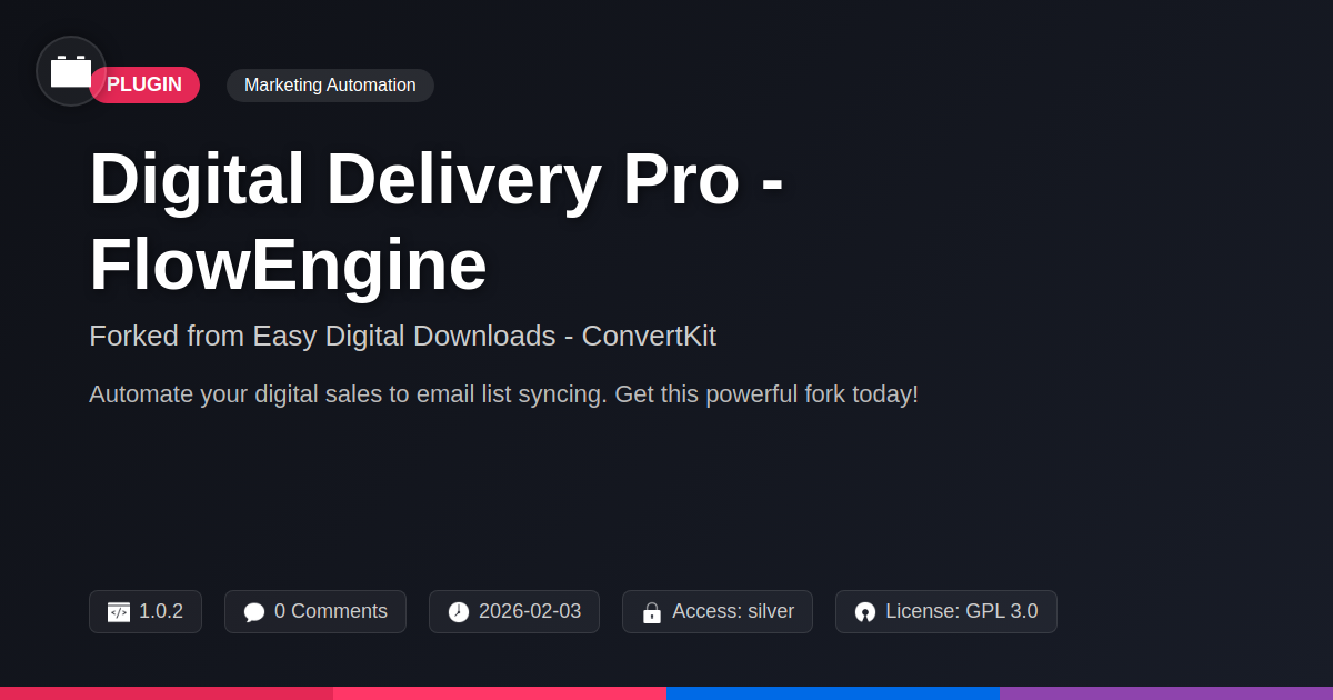 You know that feeling when a tool just works? Meet the FlowEngine fork. This isn't your typical plugin extension. It's a community-built gem. Think of it as a trusty wrench, designed for one precise job: connecting your digital product sales directly to your email marketing service. No fuss, no frills. It simply takes the crucial sales data and sends it where it needs to go. Our open-source approach means radical transparency. You're empowered. As a forked project, it thrives on community spirit and independent development. It’s all about making your sales-to-email sync seamless. This dependable mate ensures your customer data flows smoothly, so you can focus on what truly matters: building your business. It’s a straightforward solution for efficient communication. This fork embodies our commitment to user control and robust functionality.