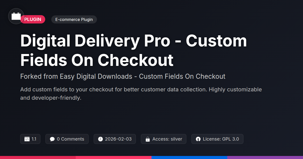 GrootMade is NOT affiliated with Easy Digital Downloads - Custom Fields On Checkout or its original author. Easy Digital Downloads - Custom Fields On Checkout™ is a trademark of its respective owner and use of it does not imply any endorsement or affiliation. This product has been forked under the GNU General Public License (GPL) and all non-GPL assets (such as proprietary images, fonts, and branding) have been removed. Distributing GPL-licensed code is 100% legal.