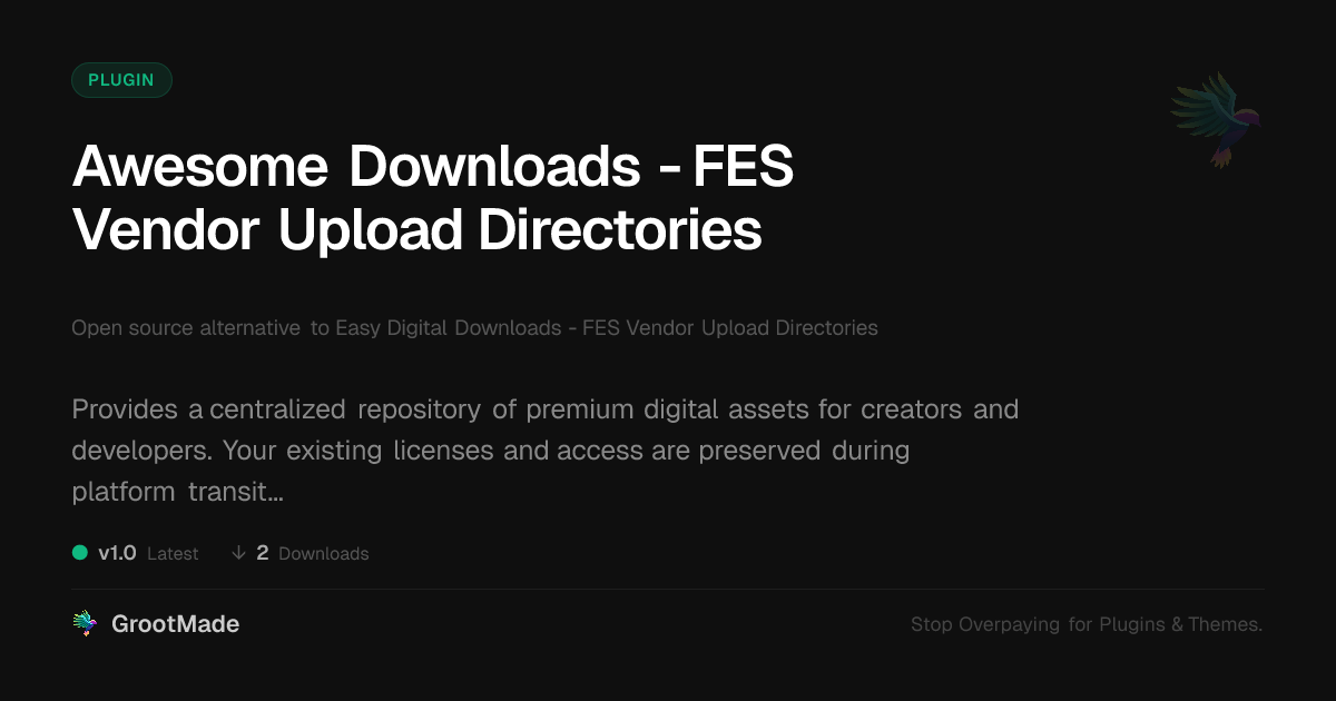 GrootMade is NOT affiliated with Easy Digital Downloads - FES Vendor Upload Directories or its original author. Easy Digital Downloads - FES Vendor Upload Directories™ is a trademark of its respective owner and use of it does not imply any endorsement or affiliation. This product has been forked under the GNU General Public License (GPL) and all non-GPL assets (such as proprietary images, fonts, and branding) have been removed. Distributing GPL-licensed code is 100% legal.