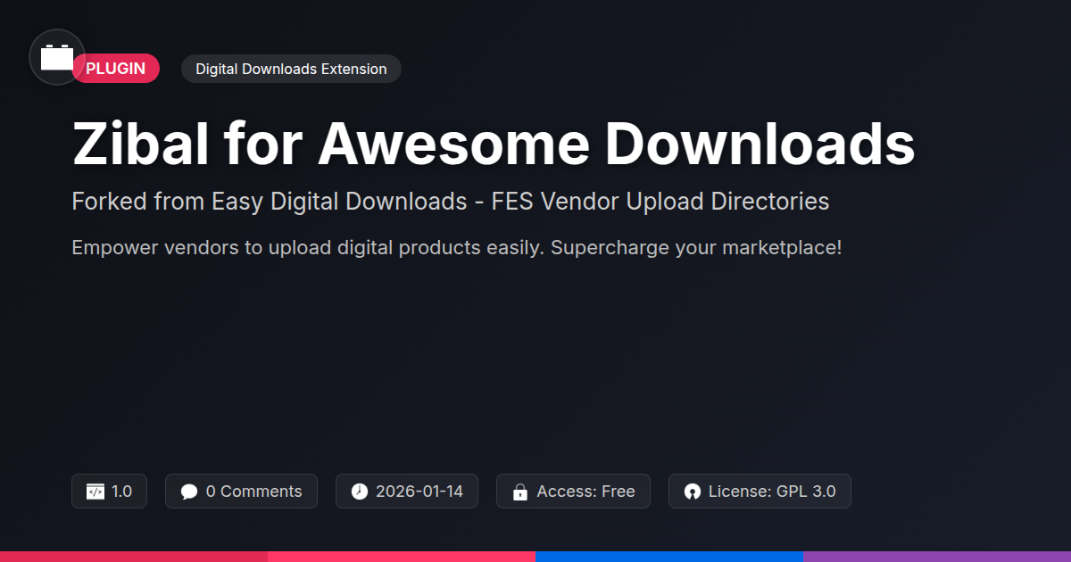 GrootMade is NOT affiliated with Easy Digital Downloads - FES Vendor Upload Directories or its original author. Easy Digital Downloads - FES Vendor Upload Directories™ is a trademark of its respective owner and use of it does not imply any endorsement or affiliation. This product has been forked under the GNU General Public License (GPL) and all non-GPL assets (such as proprietary images, fonts, and branding) have been removed. Distributing GPL-licensed code is 100% legal.