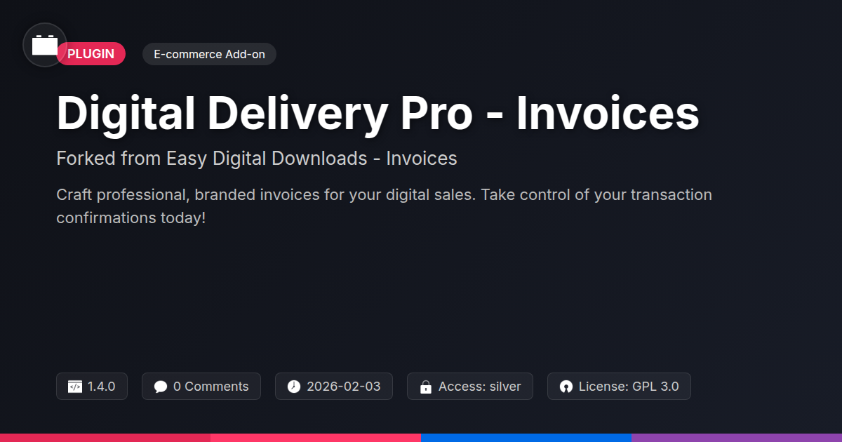 GrootMade is NOT affiliated with Easy Digital Downloads - Invoices or its original author. Easy Digital Downloads - Invoices™ is a trademark of its respective owner and use of it does not imply any endorsement or affiliation. This product has been forked under the GNU General Public License (GPL) and all non-GPL assets (such as proprietary images, fonts, and branding) have been removed. Distributing GPL-licensed code is 100% legal.