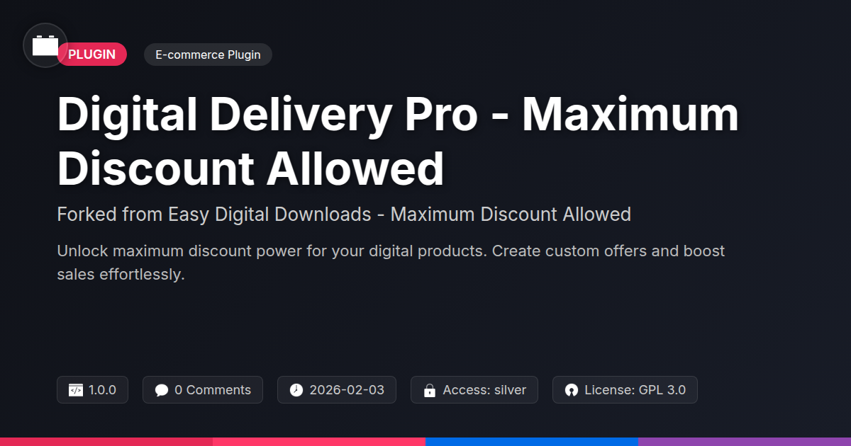 GrootMade is NOT affiliated with Easy Digital Downloads - Maximum Discount Allowed or its original author. Easy Digital Downloads - Maximum Discount Allowed™ is a trademark of its respective owner and use of it does not imply any endorsement or affiliation. This product has been forked under the GNU General Public License (GPL) and all non-GPL assets (such as proprietary images, fonts, and branding) have been removed. Distributing GPL-licensed code is 100% legal.