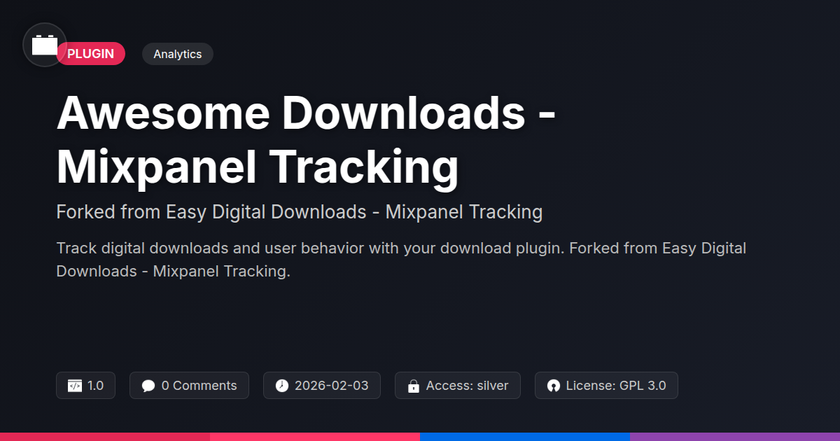 GrootMade is NOT affiliated with Easy Digital Downloads - Mixpanel Tracking or its original author. Easy Digital Downloads - Mixpanel Tracking™ is a trademark of its respective owner and use of it does not imply any endorsement or affiliation. This product has been forked under the GNU General Public License (GPL) and all non-GPL assets (such as proprietary images, fonts, and branding) have been removed. Distributing GPL-licensed code is 100% legal.