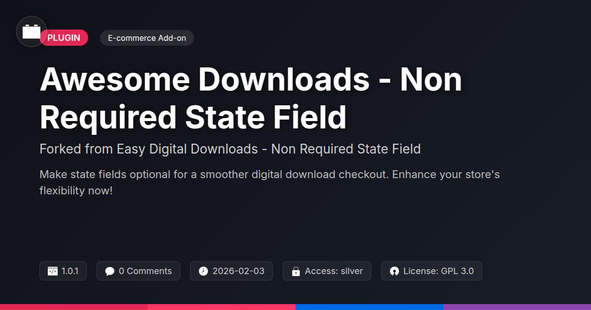 GrootMade is NOT affiliated with Easy Digital Downloads - Non Required State Field or its original author. Easy Digital Downloads - Non Required State Field™ is a trademark of its respective owner and use of it does not imply any endorsement or affiliation. This product has been forked under the GNU General Public License (GPL) and all non-GPL assets (such as proprietary images, fonts, and branding) have been removed. Distributing GPL-licensed code is 100% legal.