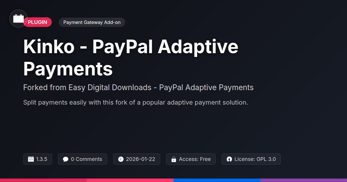 GrootMade is NOT affiliated with Easy Digital Downloads - PayPal Adaptive Payments or its original author. Easy Digital Downloads - PayPal Adaptive Payments™ is a trademark of its respective owner and use of it does not imply any endorsement or affiliation. This product has been forked under the GNU General Public License (GPL) and all non-GPL assets (such as proprietary images, fonts, and branding) have been removed. Distributing GPL-licensed code is 100% legal.