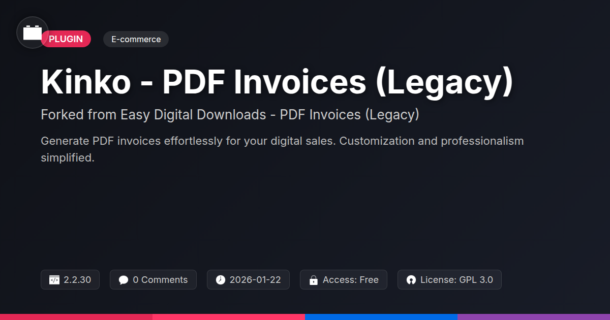 So there you have it. You've navigated the treacherous waters of manual invoicing and emerged, blinking but enlightened, into the sunshine of professional, automated document generation. Kinko - PDF Invoices (Legacy) isn't just another plugin; it's your digital invoice secret weapon. It's the suave diplomat your sales process has been missing, ensuring every transaction, from that tiny micro-purchase to your biggest client deal, is met with a PDF that says, 'We've got this.' For developers and agencies who pride themselves on clean code and polished delivery, this tool harmonizes with your ethos. And for the open-source evangelists among us, it embodies the spirit of collaboration and refinement – a legacy of functionality continuing to serve. Stop letting archaic invoicing methods hold your business back. It’s time to ditch the spreadsheets that look like abstract art gone wrong and embrace a solution that’s both robust and, dare we say, a little bit charming. Empower your online store with invoices that are not just functional, but a genuine reflection of your brand’s professionalism and attention to detail. Now go forth, generate those flawless PDFs, and get back to what you do best – building and selling amazing digital products.