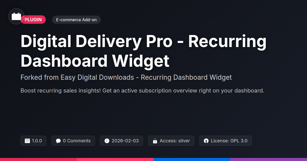 GrootMade is NOT affiliated with Easy Digital Downloads - Recurring Dashboard Widget or its original author. Easy Digital Downloads - Recurring Dashboard Widget™ is a trademark of its respective owner and use of it does not imply any endorsement or affiliation. This product has been forked under the GNU General Public License (GPL) and all non-GPL assets (such as proprietary images, fonts, and branding) have been removed. Distributing GPL-licensed code is 100% legal.