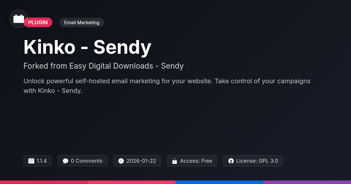 GrootMade is NOT affiliated with Easy Digital Downloads - Sendy or its original author. Easy Digital Downloads - Sendy™ is a trademark of its respective owner and use of it does not imply any endorsement or affiliation. This product has been forked under the GNU General Public License (GPL) and all non-GPL assets (such as proprietary images, fonts, and branding) have been removed. Distributing GPL-licensed code is 100% legal.