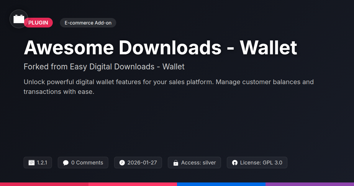 GrootMade is NOT affiliated with Easy Digital Downloads - Wallet or its original author. Easy Digital Downloads - Wallet™ is a trademark of its respective owner and use of it does not imply any endorsement or affiliation. This product has been forked under the GNU General Public License (GPL) and all non-GPL assets (such as proprietary images, fonts, and branding) have been removed. Distributing GPL-licensed code is 100% legal.