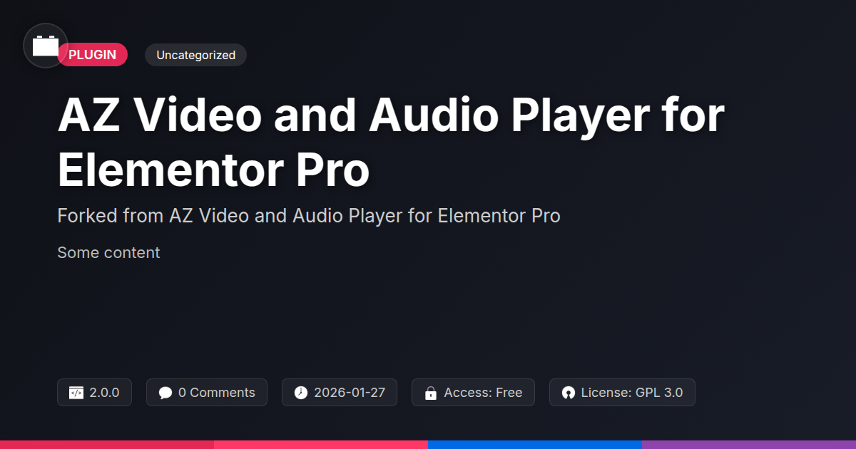 GrootMade is NOT affiliated with AZ Video and Audio Player for Elementor Pro or its original author. AZ Video and Audio Player for Elementor Pro™ is a trademark of its respective owner and use of it does not imply any endorsement or affiliation. This product has been forked under the GNU General Public License (GPL) and all non-GPL assets (such as proprietary images, fonts, and branding) have been removed. Distributing GPL-licensed code is 100% legal.