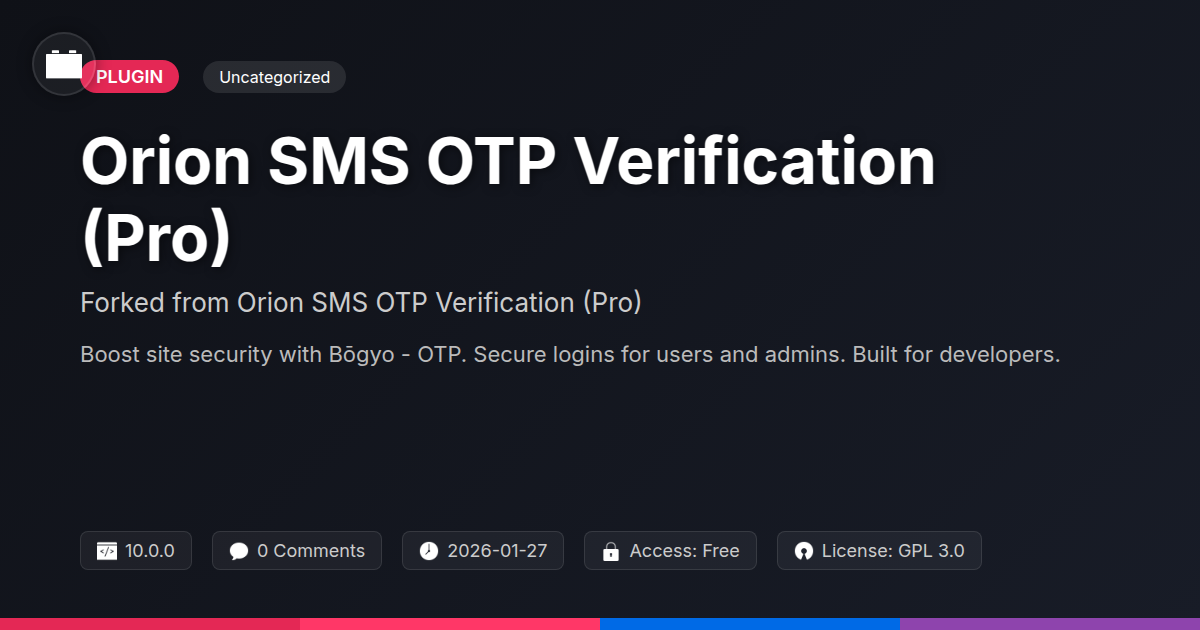 GrootMade is NOT affiliated with Orion SMS OTP Verification (Pro) or its original author. Orion SMS OTP Verification (Pro)™ is a trademark of its respective owner and use of it does not imply any endorsement or affiliation. This product has been forked under the GNU General Public License (GPL) and all non-GPL assets (such as proprietary images, fonts, and branding) have been removed. Distributing GPL-licensed code is 100% legal.