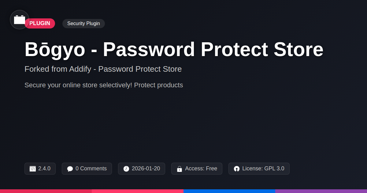 So, there you have it. You’ve battled the wild west of the internet, built digital empires, and now you’re faced with the age-old conundrum: how do you keep your most prized possessions from becoming public domain? You could try a complex custom-build that’ll have you debugging until the next solar eclipse, or you could embrace a solution that’s as smart as it is straightforward. We’re talking about giving your sensitive content the VIP treatment it deserves, without making your users jump through a bureaucratic hoop. Bōgyo - Password Protect Store is that solution. It’s forged from a legacy of solid code, designed for the pragmatic developer, the agency that values efficiency, and the open-source advocate who understands the power of a well-maintained, community-backed tool. It allows you to be the discerning gatekeeper of your digital realm, whether that’s a curated collection of high-ticket items, exclusive member-only resources, or even just that one page you’re not quite ready to unveil to the masses. Forget the frustration of overly complex security measures or the panic of a compromised listing. With Bōgyo, you gain granular control, robust protection, and the peace of mind that comes from knowing your valuable assets are precisely where you want them – secured and accessible only to those you deem worthy. It’s time to stop playing defense with your digital assets and start proactively managing access. Embrace the power of selective protection, and let Bōgyo be your digital bodyguard. Your customers (and your sanity) will thank you.