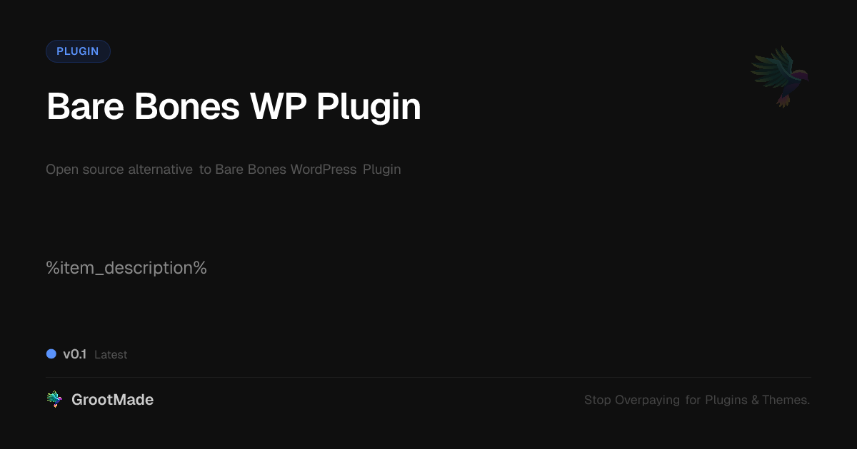 GrootMade is NOT affiliated with Bare Bones WordPress Plugin or its original author. Bare Bones WordPress Plugin™ is a trademark of its respective owner and use of it does not imply any endorsement or affiliation. This product has been forked under the GNU General Public License (GPL) and all non-GPL assets (such as proprietary images, fonts, and branding) have been removed. Distributing GPL-licensed code is 100% legal.