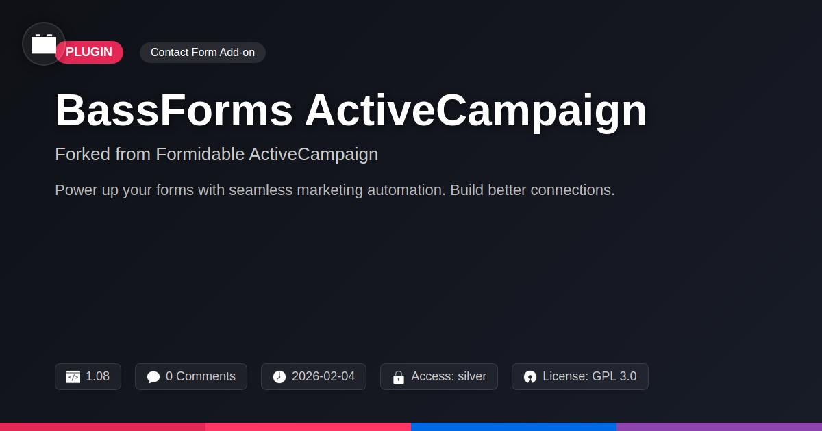 GrootMade is NOT affiliated with Formidable ActiveCampaign or its original author. Formidable ActiveCampaign™ is a trademark of its respective owner and use of it does not imply any endorsement or affiliation. This product has been forked under the GNU General Public License (GPL) and all non-GPL assets (such as proprietary images, fonts, and branding) have been removed. Distributing GPL-licensed code is 100% legal.