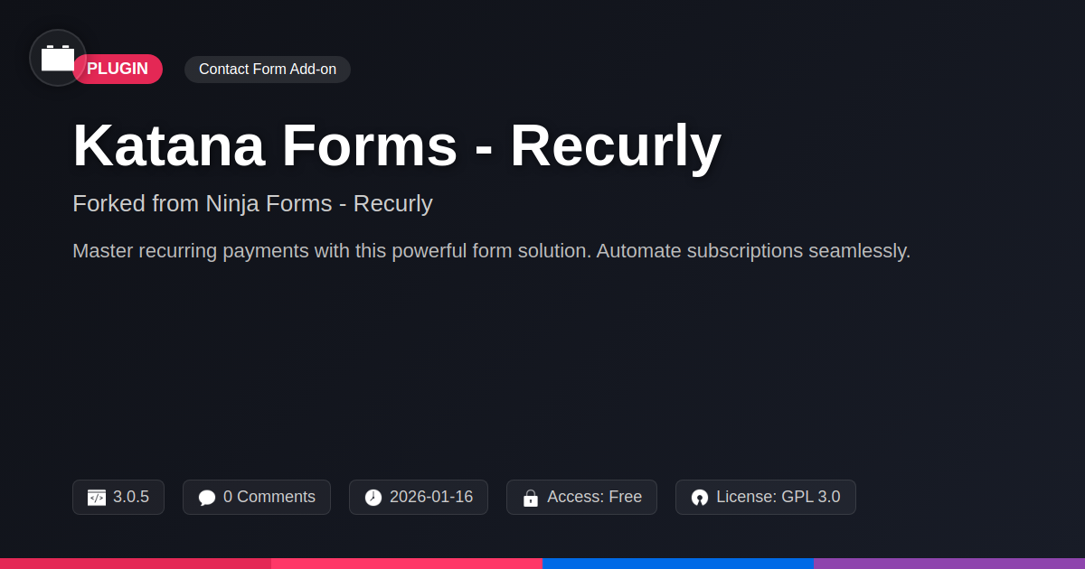 GrootMade is NOT affiliated with Ninja Forms - Recurly or its original author. Ninja Forms - Recurly™ is a trademark of its respective owner and use of it does not imply any endorsement or affiliation. This product has been forked under the GNU General Public License (GPL) and all non-GPL assets (such as proprietary images, fonts, and branding) have been removed. Distributing GPL-licensed code is 100% legal.