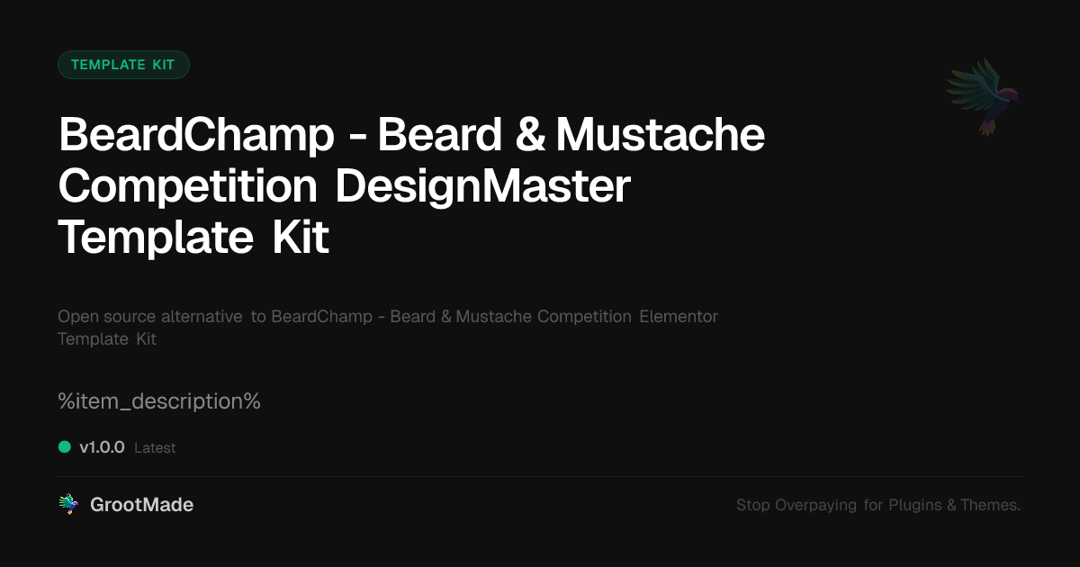 GrootMade is NOT affiliated with BeardChamp - Beard & Mustache Competition Elementor Template Kit or its original author. BeardChamp - Beard & Mustache Competition Elementor Template Kit™ is a trademark of its respective owner and use of it does not imply any endorsement or affiliation. This product has been forked under the GNU General Public License (GPL) and all non-GPL assets (such as proprietary images, fonts, and branding) have been removed. Distributing GPL-licensed code is 100% legal.