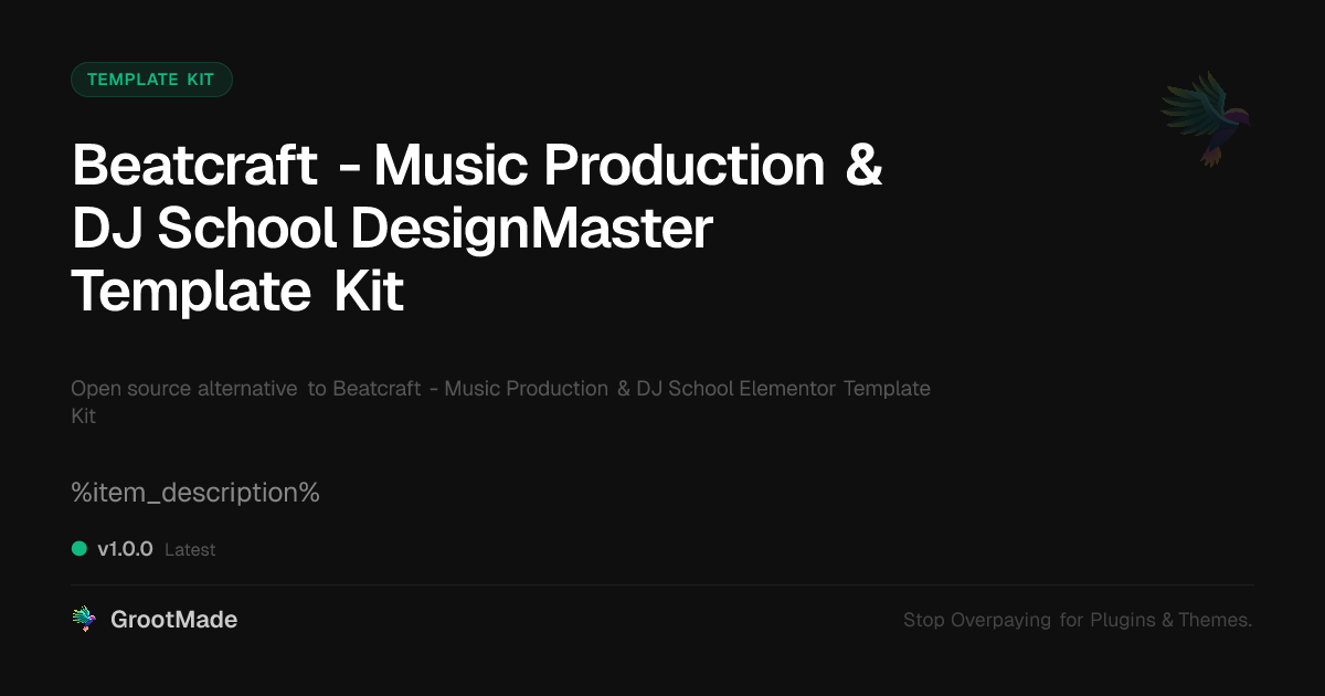GrootMade is NOT affiliated with Beatcraft - Music Production & DJ School Elementor Template Kit or its original author. Beatcraft - Music Production & DJ School Elementor Template Kit™ is a trademark of its respective owner and use of it does not imply any endorsement or affiliation. This product has been forked under the GNU General Public License (GPL) and all non-GPL assets (such as proprietary images, fonts, and branding) have been removed. Distributing GPL-licensed code is 100% legal.