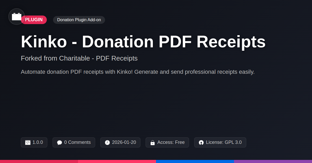 So, there you have it. Kinko - Donation PDF Receipts. It’s the digital equivalent of finding a perfectly formatted, typo-free code snippet that just works. We’ve all been there, drowning in administrative tasks that detract from the real work, whether that's building awesome sites, managing client campaigns, or simply enjoying the open-source playground. This plugin, born from the lineage of a respected tool but forged with a fresh commitment to functionality and accessibility, aims to be that reliable workhorse. It’s designed for the pragmatic developer, the agency that values efficiency, and the open-source advocate who understands the power of well-crafted, community-supported solutions. No more frantic searches for donation records, no more embarrassing email mix-ups. Just the peace of mind that comes with automated, professional, and customizable PDF receipts. It’s about reclaiming your time, reinforcing your professionalism, and ensuring your donors feel appreciated with every contribution. Think of it as an upgrade to your operational infrastructure – a small change that makes a significant difference. Because in the end, a smooth administrative process allows both you and your cause to thrive. So go ahead, integrate Kinko, and spend less time wrestling with paperwork and more time focusing on what truly matters.