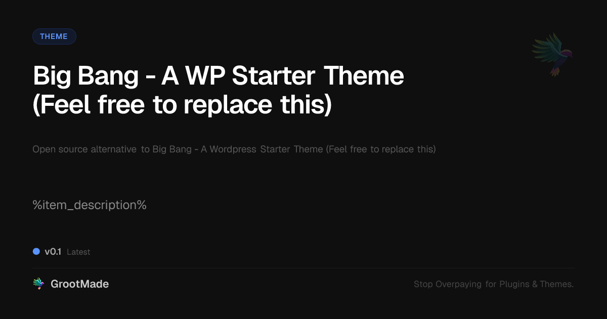 GrootMade is NOT affiliated with Big Bang - A Wordpress Starter Theme (Feel free to replace this) or its original author. Big Bang - A Wordpress Starter Theme (Feel free to replace this)™ is a trademark of its respective owner and use of it does not imply any endorsement or affiliation. This product has been forked under the GNU General Public License (GPL) and all non-GPL assets (such as proprietary images, fonts, and branding) have been removed. Distributing GPL-licensed code is 100% legal.