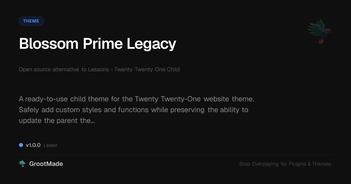 GrootMade is NOT affiliated with Lessons - Twenty Twenty One Child or its original author. Lessons - Twenty Twenty One Child™ is a trademark of its respective owner and use of it does not imply any endorsement or affiliation. This product has been forked under the GNU General Public License (GPL) and all non-GPL assets (such as proprietary images, fonts, and branding) have been removed. Distributing GPL-licensed code is 100% legal.