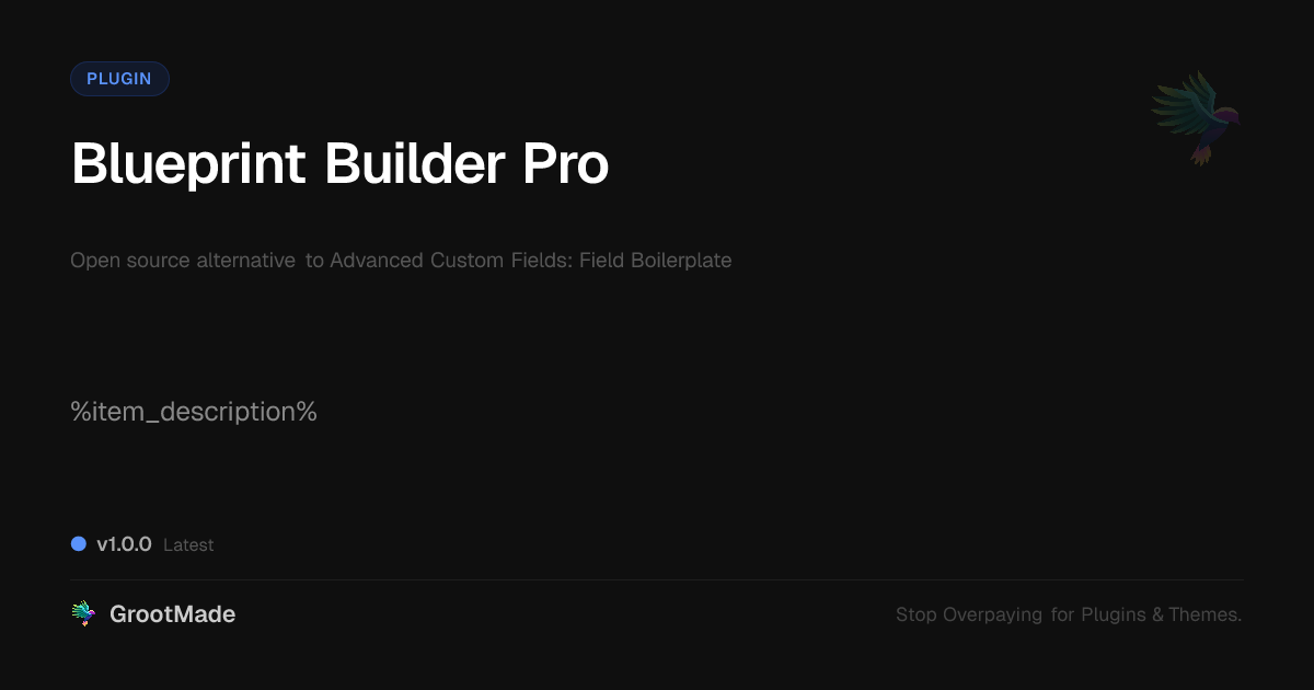 GrootMade is NOT affiliated with Advanced Custom Fields: Field Boilerplate or its original author. Advanced Custom Fields: Field Boilerplate™ is a trademark of its respective owner and use of it does not imply any endorsement or affiliation. This product has been forked under the GNU General Public License (GPL) and all non-GPL assets (such as proprietary images, fonts, and branding) have been removed. Distributing GPL-licensed code is 100% legal.