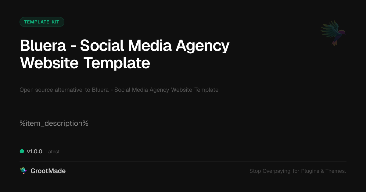 GrootMade is NOT affiliated with Bluera - Social Media Agency Website Template or its original author. Bluera - Social Media Agency Website Template™ is a trademark of its respective owner and use of it does not imply any endorsement or affiliation. This product has been forked under the GNU General Public License (GPL) and all non-GPL assets (such as proprietary images, fonts, and branding) have been removed. Distributing GPL-licensed code is 100% legal.