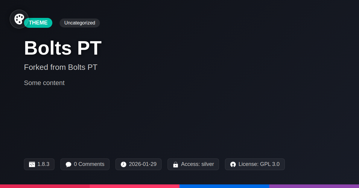 GrootMade is NOT affiliated with Bolts PT or its original author. Bolts PT™ is a trademark of its respective owner and use of it does not imply any endorsement or affiliation. This product has been forked under the GNU General Public License (GPL) and all non-GPL assets (such as proprietary images, fonts, and branding) have been removed. Distributing GPL-licensed code is 100% legal.