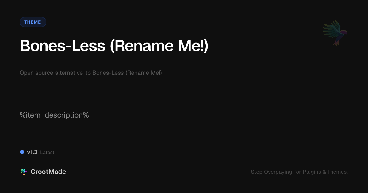GrootMade is NOT affiliated with Bones-Less (Rename Me!) or its original author. Bones-Less (Rename Me!)™ is a trademark of its respective owner and use of it does not imply any endorsement or affiliation. This product has been forked under the GNU General Public License (GPL) and all non-GPL assets (such as proprietary images, fonts, and branding) have been removed. Distributing GPL-licensed code is 100% legal.